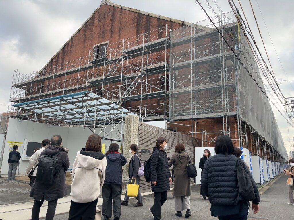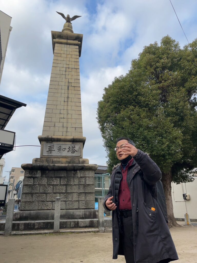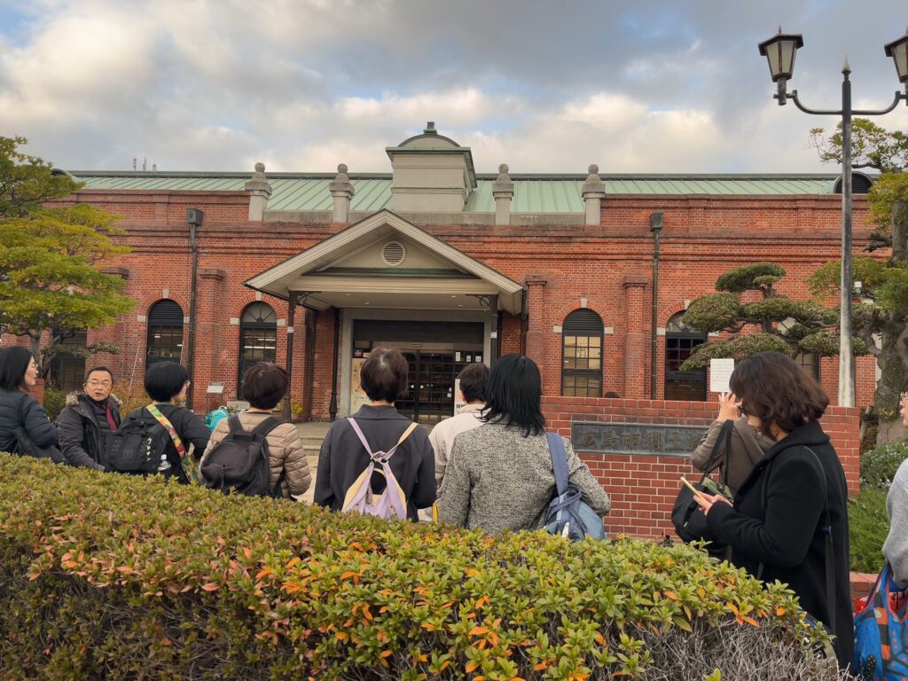 午後からは、フィールドワークを行いました。皆実町まで市内電車で移動し、ガイドの東琢磨さんの話を聞きながら、戦前は、専売局たばこ工場として菊の御紋の天皇拝領※の煙草が作られていたところ(戦後、専売公社となり、現在は大型スーパーマーケットになっている)や、被爆建物である旧陸軍被服支廠、平和塔(戦後に塔の名前が「日清戦争凱旋碑」から現在の名前に変更されていた)、宇品港を作った千田貞暁県令(県知事)を祭る千田廟公園、天皇行幸を迎えるため提灯を持った人たちがあふれたという御幸(みゆき)通りを歩き、広島市郷土資料館まで歩きました。