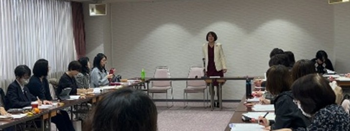 まず、日教組女性部常任委員の福山香織さんから中央情勢報告がありました。去る11月19日の全国母女府省要請では、文科省を始め、厚労省、内閣府、防衛省、子ども家庭庁等への要請をしたこと、参議院議員の古賀千景さん(日政連議員)とともに文科省への要請で洋式トイレや男性のトイレの個室化について訴えたことなどを話されました。「女性部としてしっかり抗っていかなくてはいけない」と強く訴えられました。